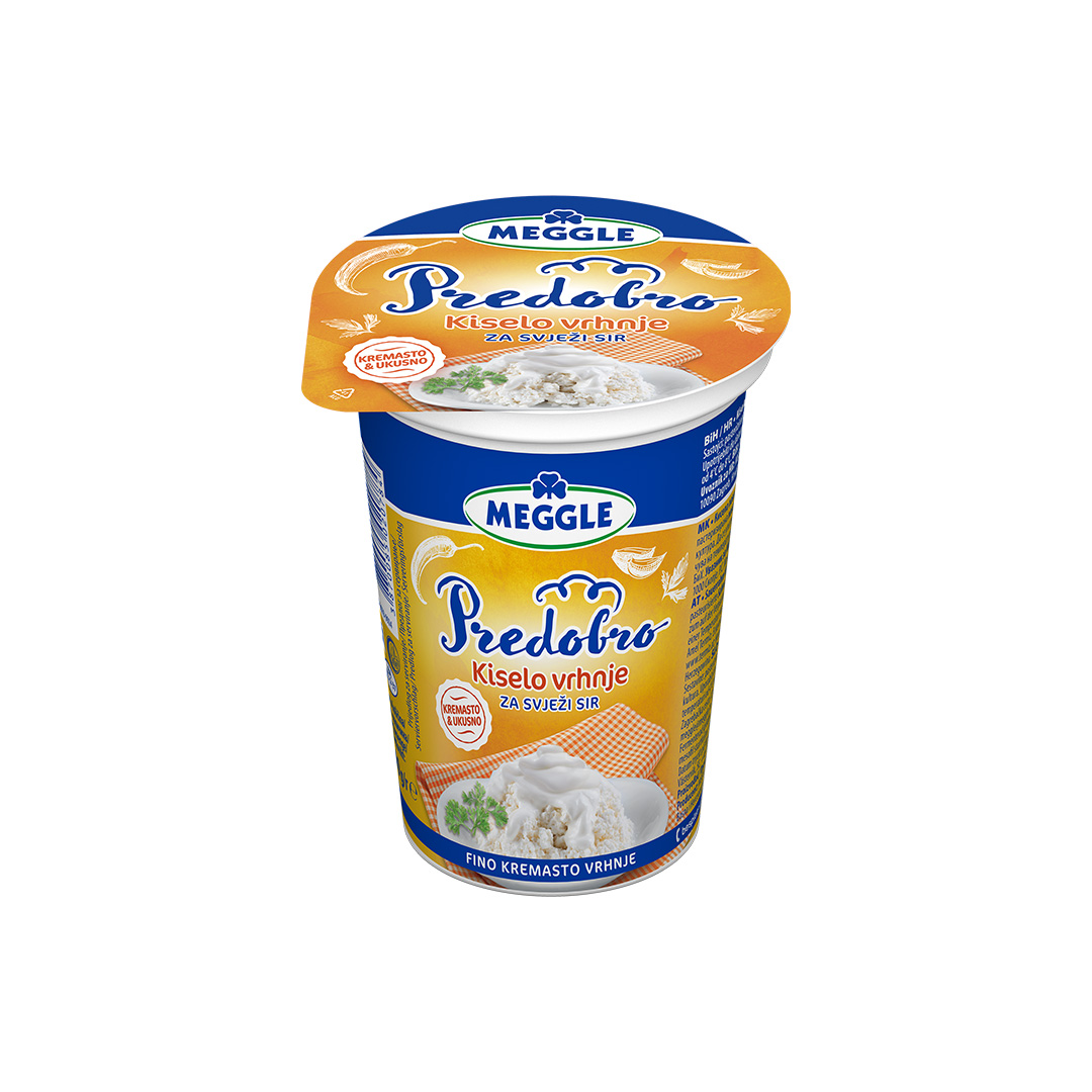 Savršena kremasta tekstura i raskošan okus čine MEGGLE kiselo vrhnje za svježi sir nezaobilaznim gurmanskim pomagačem u kuhinji. Izuzetan je kao dodatak za svježi sir, pite, nadjeve i krem juhe te mnoga druga jela. Također, MEGGLE kiselo vrhnje za svježi sir učinit će svaku salatu ili predjelo posebnim. Okusite vrhunski užitak jedinstvene recepture! Predobro Kiselo vrhnje za svježi sir. Uz sva jela. Za sve prilike. Jednostavno predobro. Mmm…kao MEGGLE.